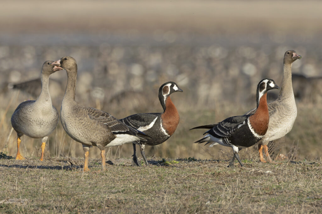 Day 2-4. At the end of October and the beginning of November the vast hordes of geese arrive to the Hortobágy from the north. They more or less substitute the Cranes which by this time moving south although a few thousand will certainly be around! During our three days stay, we will focus on seeing the vulnerable Red-breasted Goose and Lesser White-fronted Goose. If luck is on our side and we see them easily we will also have time to visit other type of habitats of the Hortobágy and in its close surroundings. All this takes place in the tranquil environment of the beautiful steppe landscape. In the large Greater White-fronted Geese flocks we will also have the chance to find Greyleg, Bernacle Goose and Taiga Bean Goose. At the various wetlands we will see White-tailed Eagles spread panic amongst the large gatherings of waterbirds, often causing them to take flight in huge swarming flocks. The rich rodent population of the grasslands supports a healthy number of predators. Among the many Common Buzzards we will see Rough-legged Buzzard, Peregrine Falcon, Merlin, Hen Harrier from the north and if we lucky a long staying Long-legged Buzzard can still be around. Best of all however is the magnificent Saker – surely Europe’s most enigmatic falcon. If we really lucky even the scarce Greater Spotted Eagle can be seen. On the edge of the steppe on freshly cut alfalfa fields Great Bustards are gathering in post-breeding flocks by this time of the year. In the vast reed beds the calls of Bearded Tits can often be heard and usually they are easy to see as well. In November and March we also have the chance to see some wintering birds but their appearance is unpredictable. These could include Twite, Lapland Bunting and Snow Bunting. Fieldfares and Great Grey Shrikes are more common. One day we will visit a Long-eared Owl roost – sometimes over 100 of these splendid birds have arrived by November or still around in early March. Other species we may find include Great and Pygmy Cormorants, Great Bittern, Eurasian Wigeon, Gadwall, Common Teal, Mallard, Northern Pintail, Northern Showeler, Common Pochard, Water Rail, Common Moorhen, Eurasian Coot, Grey Plover, Northern Lapwing, Common Snipe, Black-headed, Common, Caspian and Yellow-legged Gulls and Common Kingfisher. If our time allows we will make a short visit to a nearby woodland where we have the chance to find Black, Green, Great Spotted, Lesser Spotted and Middle Spotted Woodpeckers.